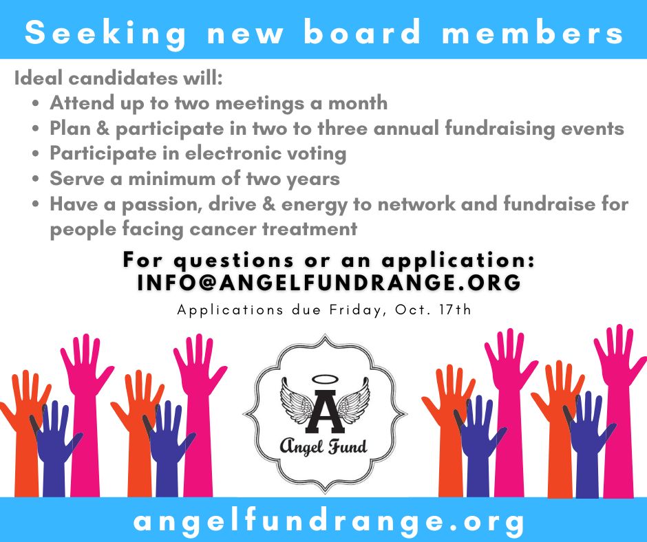 Seeking Board Members: Application Process Now openBy Kelly Grinsteinner / September 23, 2025 We are now taking applications for new board members with new ideas and a passion for helping people. Message or email us now at info@angelfundrange.org to request the application! Apps due Oct. 17!